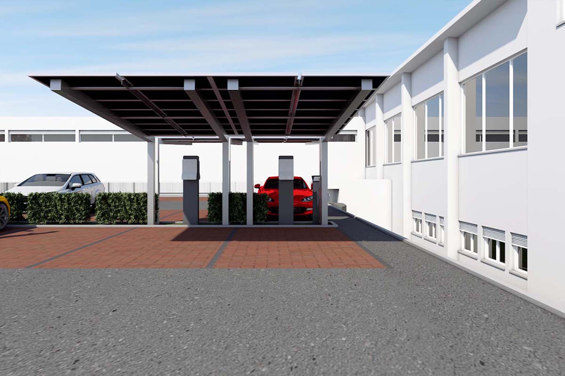 The new production wing is conceived as a low-rise, elongated volume, reinforcing horizontal production flows and minimizing vertical circulation. This configuration supports streamlined manufacturing processes and allows for future internal reconfiguration.