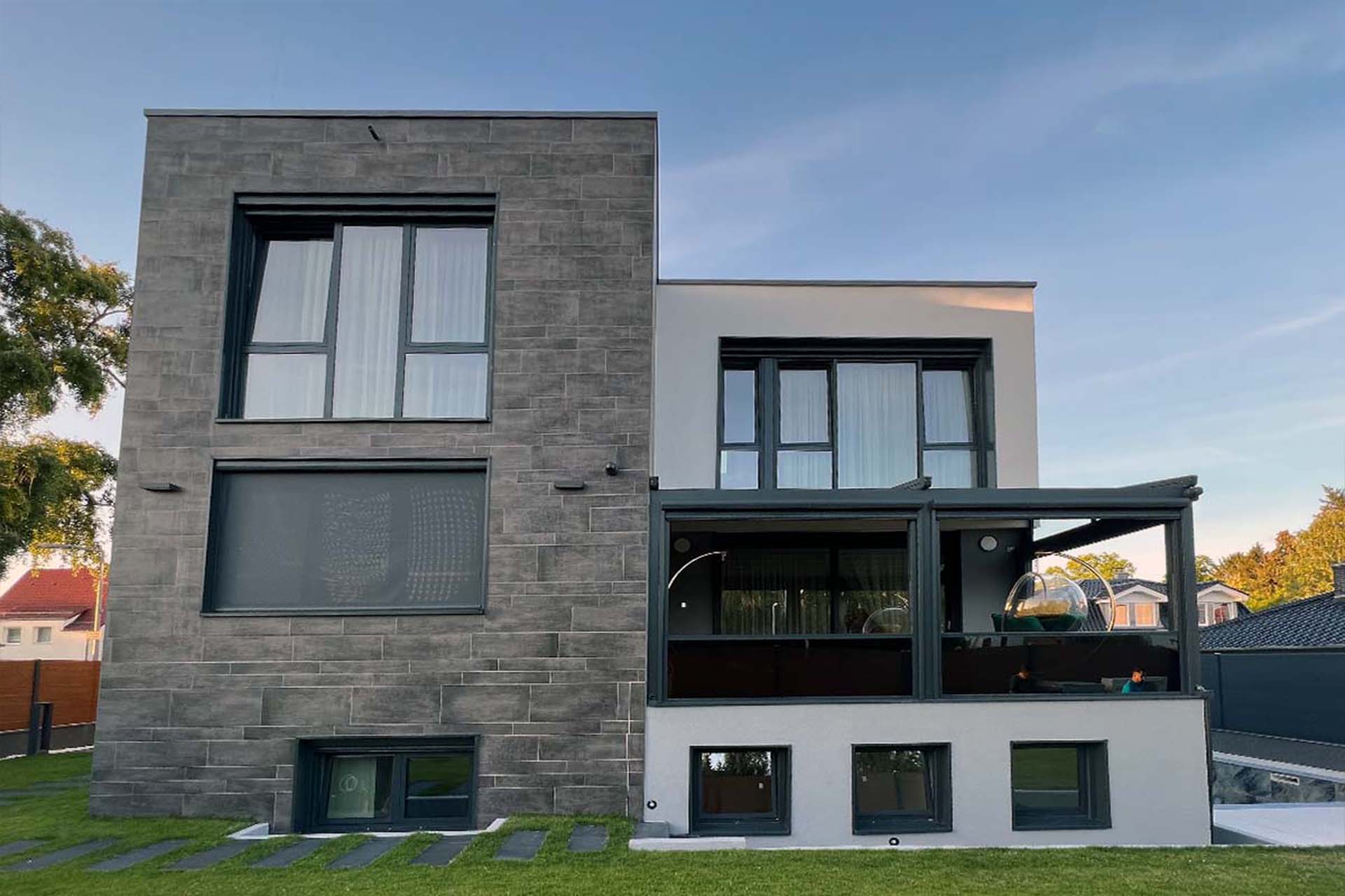 Material contrast is used strategically to express structural logic and spatial hierarchy. The darker, stone-clad base establishes grounding and permanence, while the lighter upper volume conveys levity and domestic refinement. This reading reinforces the perception of the upper living spaces as elevated, light-filled zones, separated from the more introverted functions below.