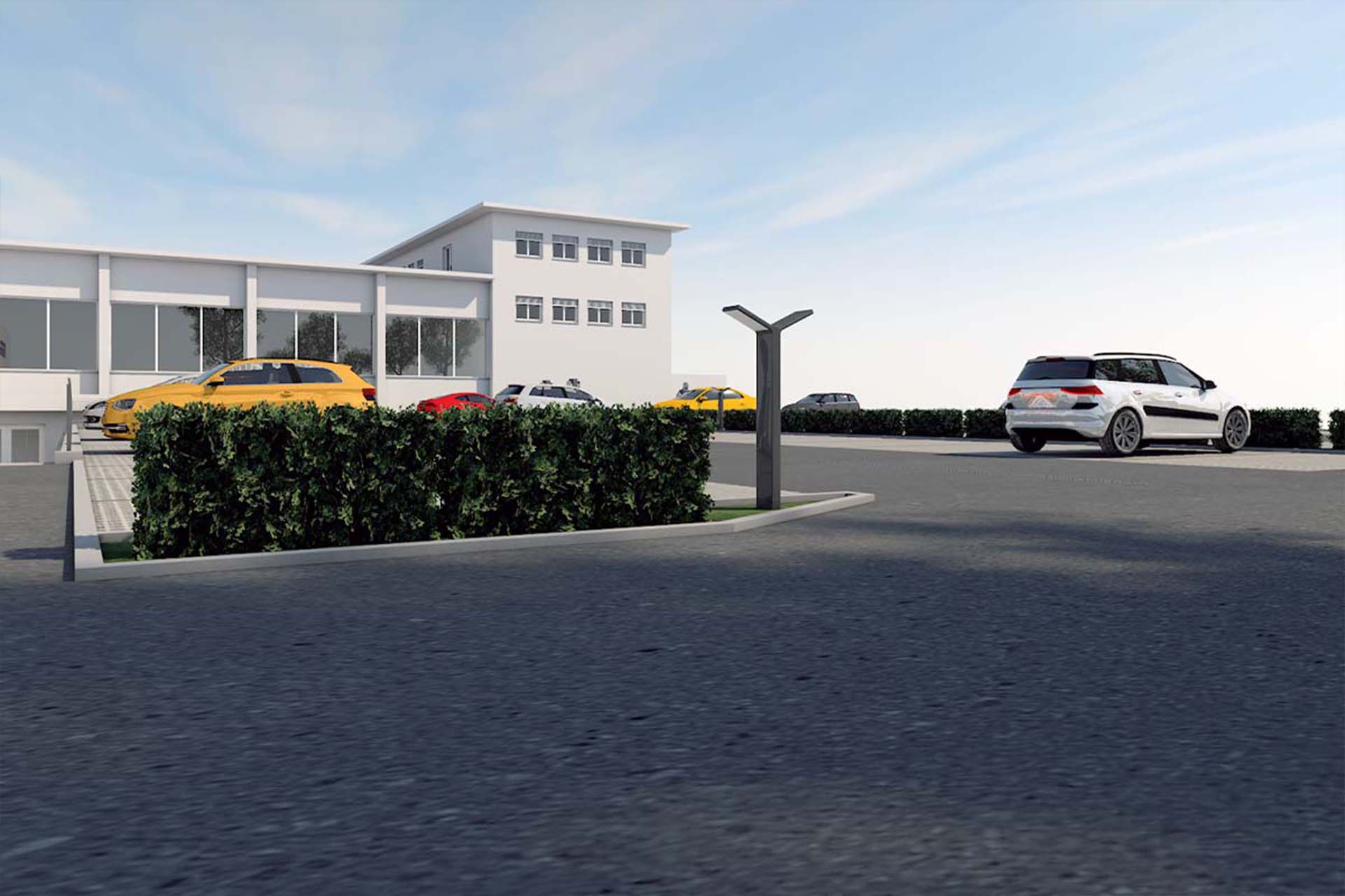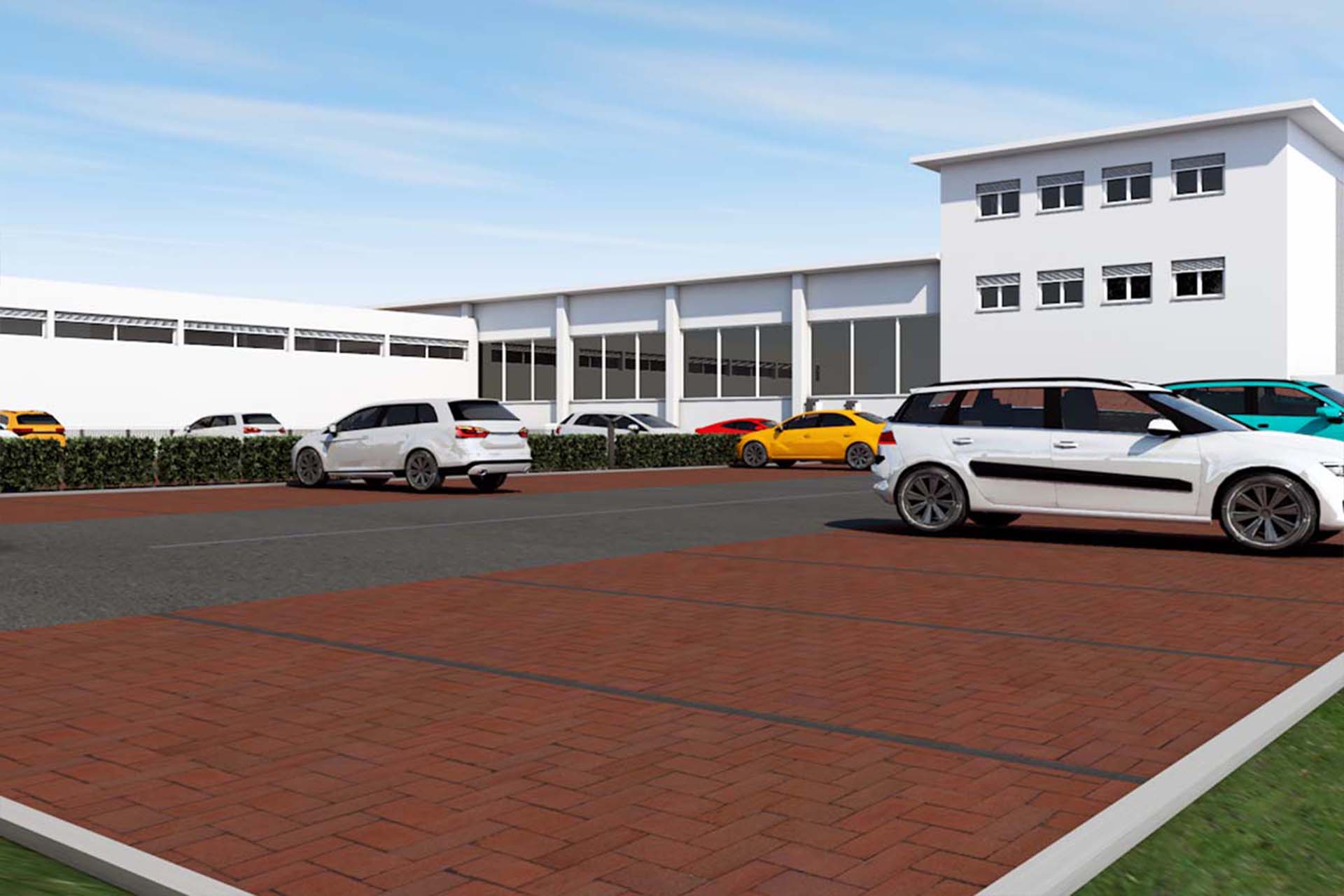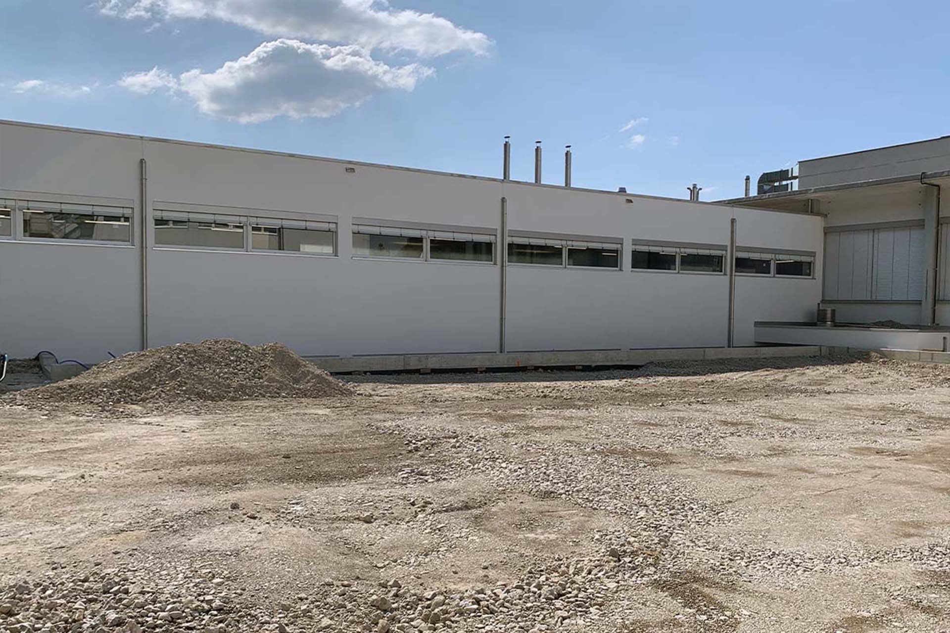 The new production wing is conceived as a low-rise, elongated volume, reinforcing horizontal production flows and minimizing vertical circulation. This configuration supports streamlined manufacturing processes and allows for future internal reconfiguration.
