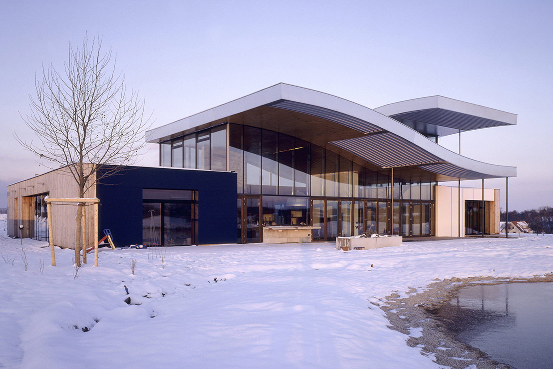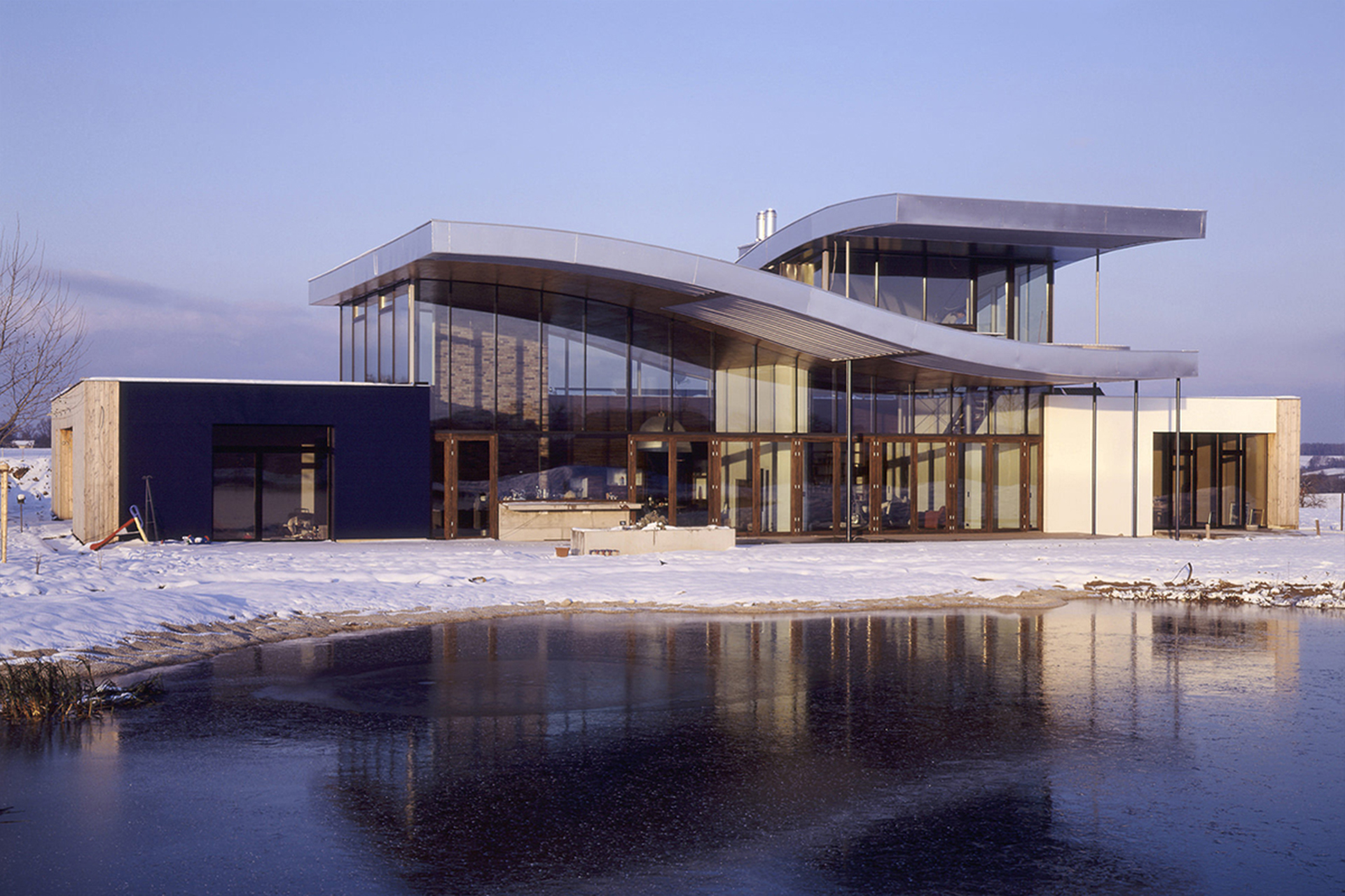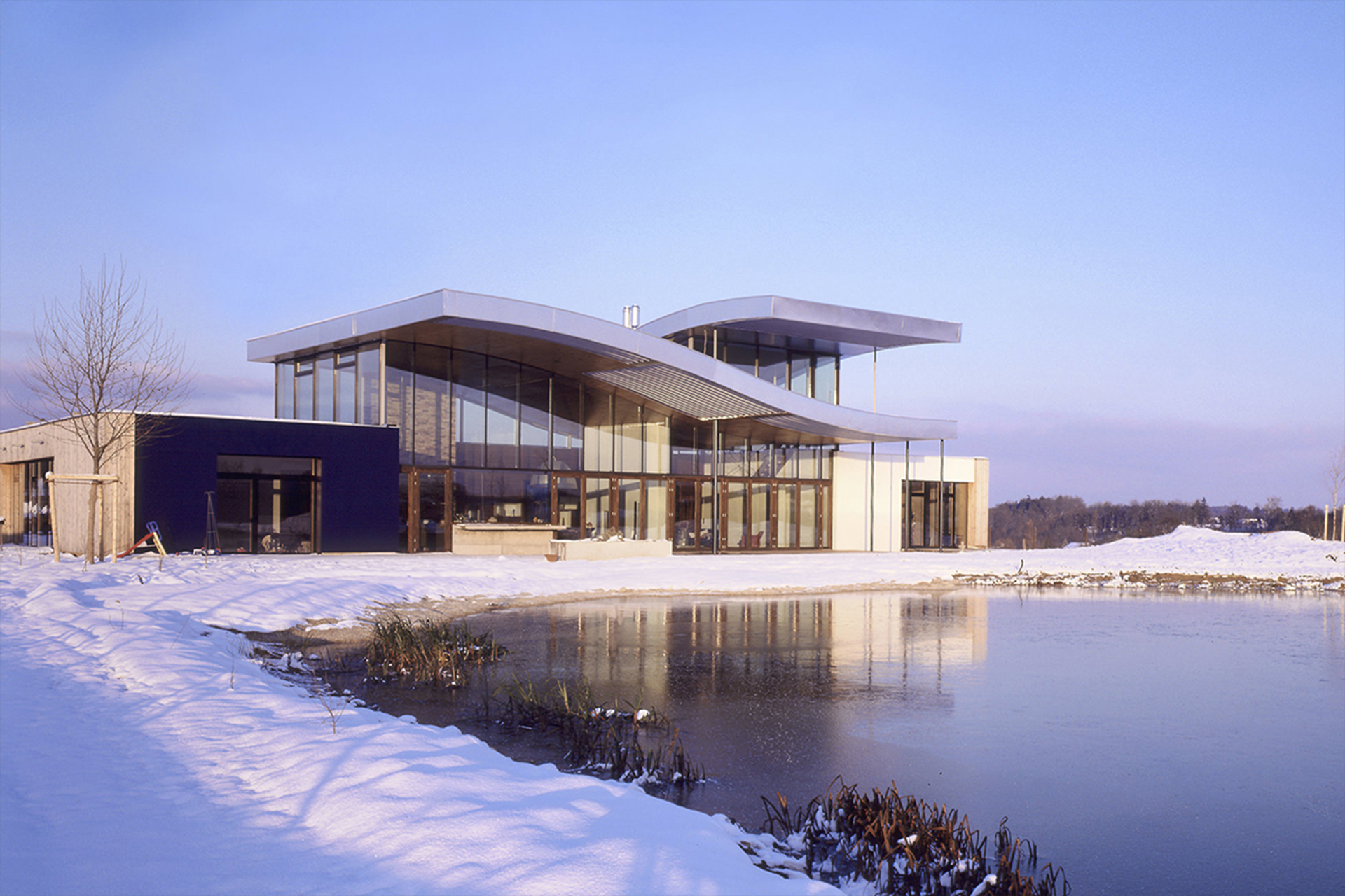 To the south, however, it opens beneath the far-projecting, wave-like roof planes toward the pond, allowing the interior living spaces to merge seamlessly with the outdoor living terrace.