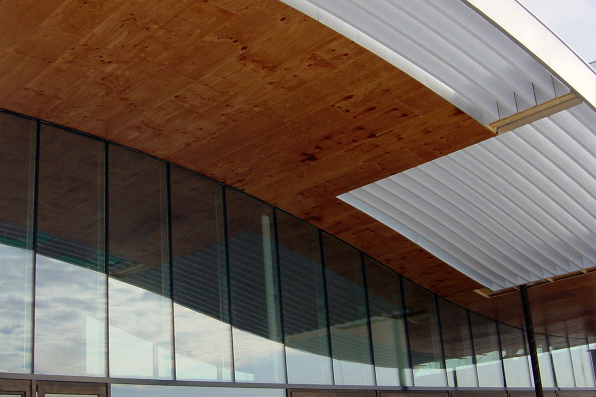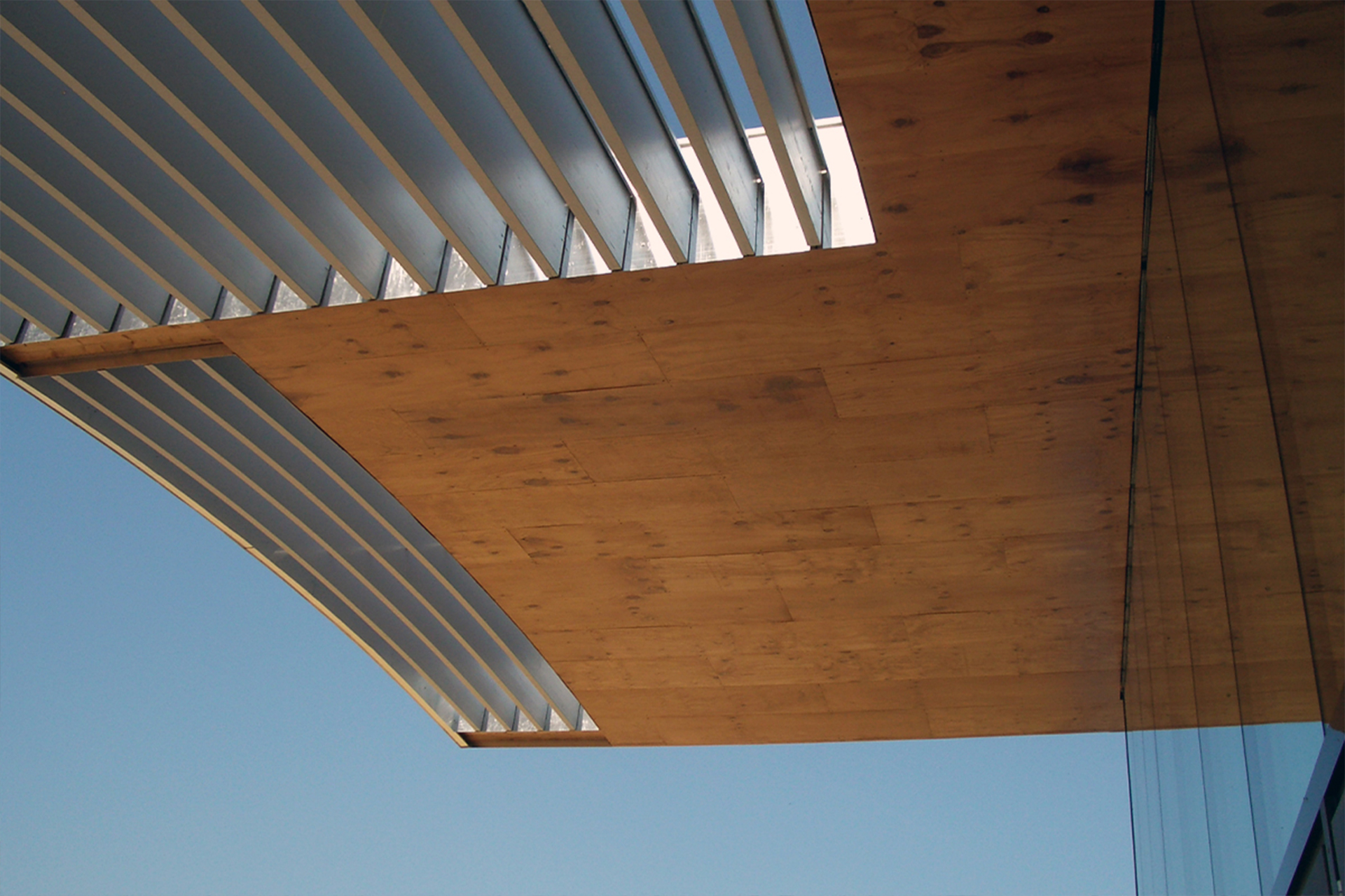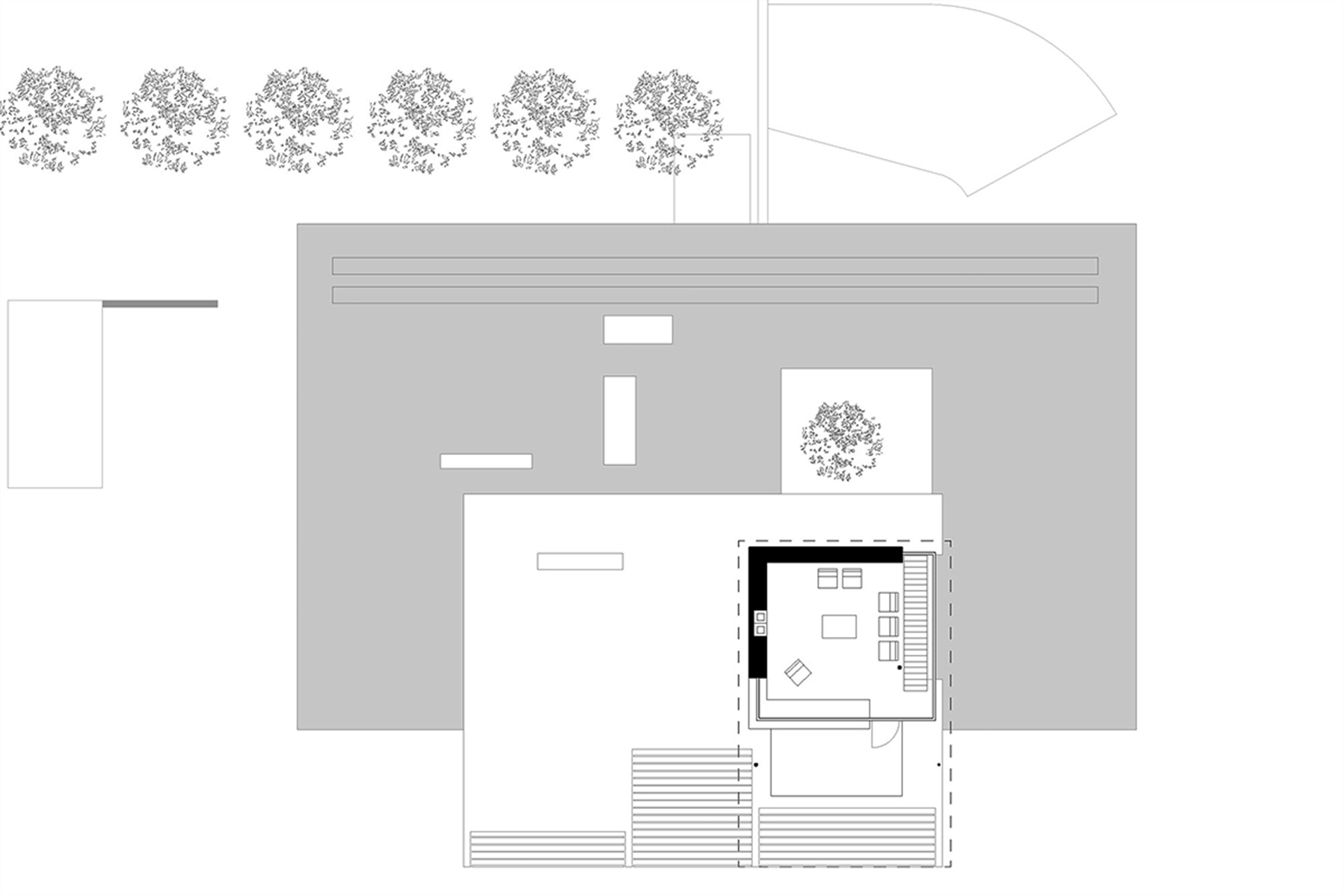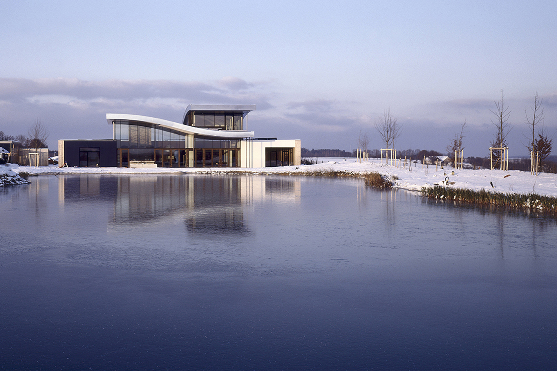 To the south, however, it opens beneath the far-projecting, wave-like roof planes toward the pond, allowing the interior living spaces to merge seamlessly with the outdoor living terrace.