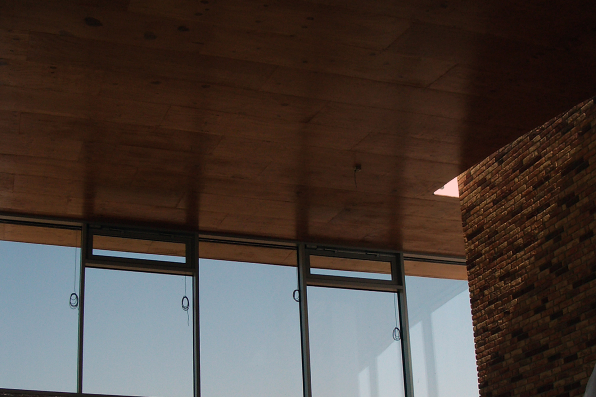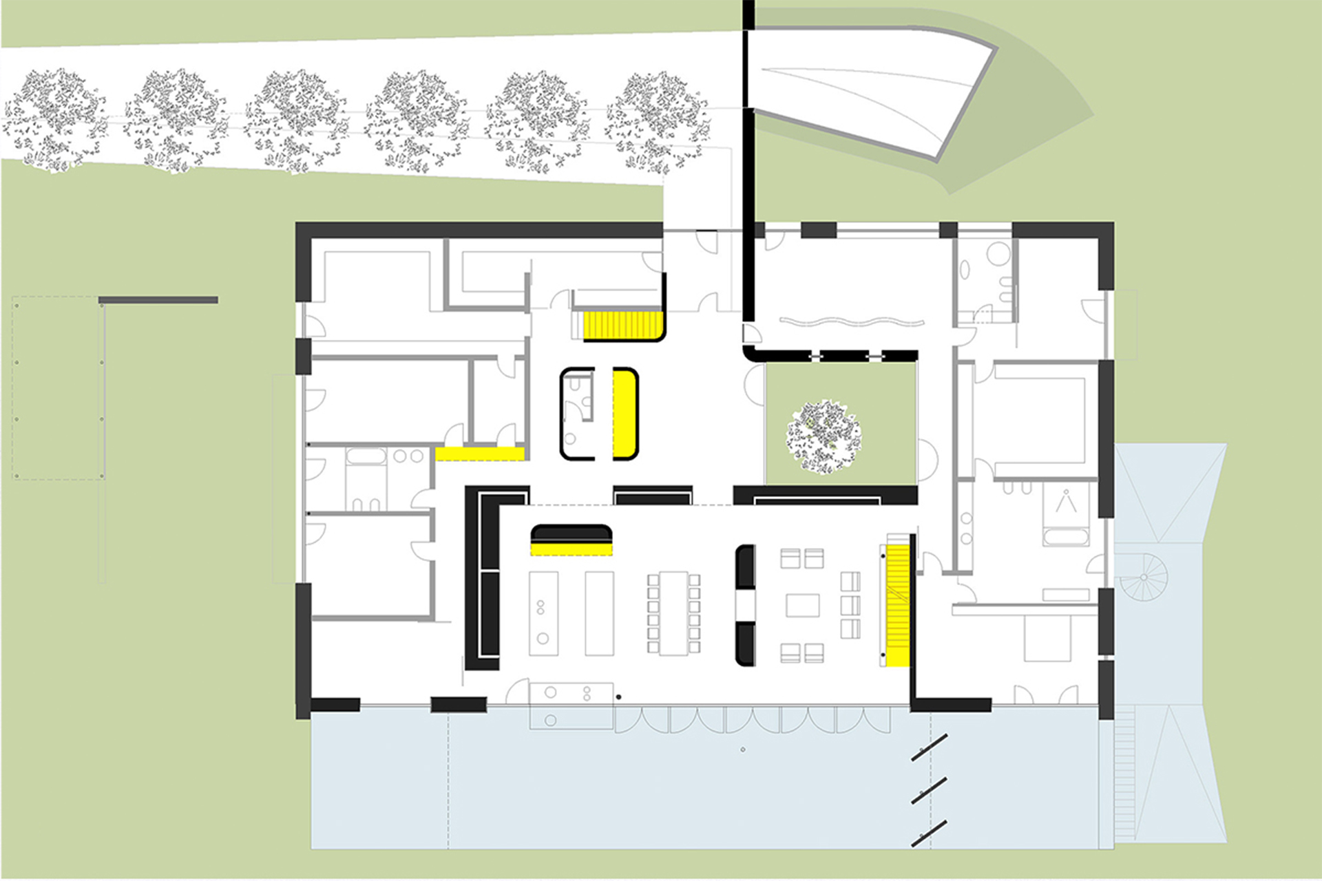 The open atrium brings a fragment of the outside world, along with generous daylight, into the heart of the house—the foyer. The reception area in the foyer, together with the adjoining atrium as an island of daylight, is conceived as a central “piazza.” Executed in calm colors and forms, it also assumes the intended additional function of an art exhibition space. The high vaulted ceiling, the space-embracing wooden framework, the freestanding exposed brick wall, and the full-height south-facing glazing define the living–dining area with warm, earthy materials and tones.